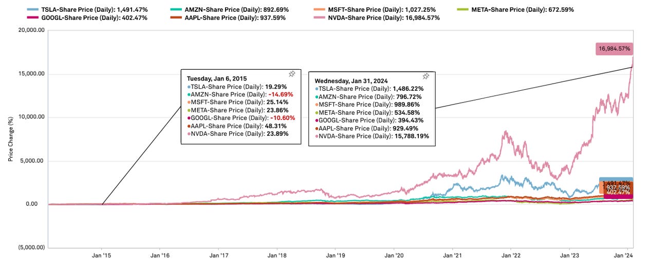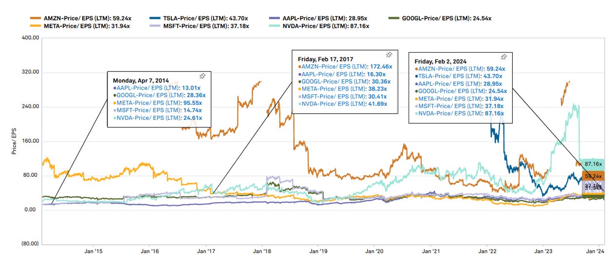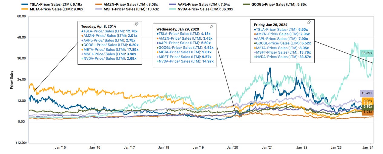 Up and away The Seven go. NVIDIA is particularly remarkable, with their price/sales multiple increasing from 2-3x to 30x+. We hope it works out for shareholders and in the meantime, we will continue to work on finding easier ideas. We always get nervous when the market gives a name to a group; The Nifty Fifty always comes to mind - https://en.wikipedia.org/wiki/Nifty_Fifty or BAT (Baidu, Alibaba, Tencent), and then there was The Four Horsemen of the Internet(Amazon, eBay, Yahoo, and AOL).