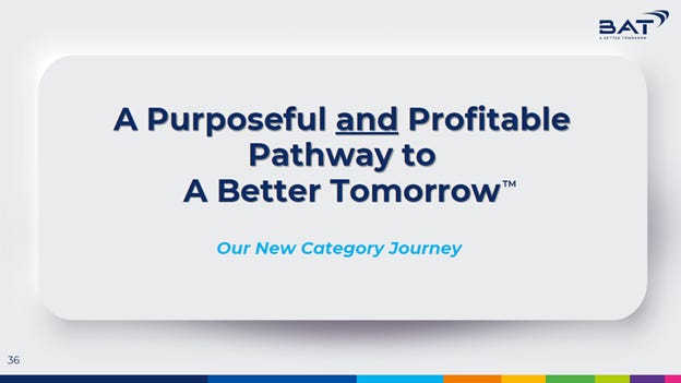 We have seen a number of articles discussing BAT. They are the mega-tobacco company you are probably thinking of, but their investor presentations take a different spin (as shown above). The best short-form summary we have found is the recent Globe and Mail piece. https://www.theglobeandmail.com/investing/investment-ideas/article-british-american-tobacco-may-lack-the-magnificent-sevens-cheery/