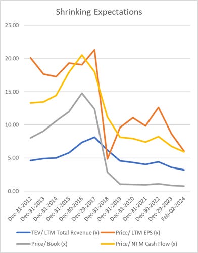 We note that it is also another interesting case study of collapsing expectations (our charts) while the underlying business appears to have improved.