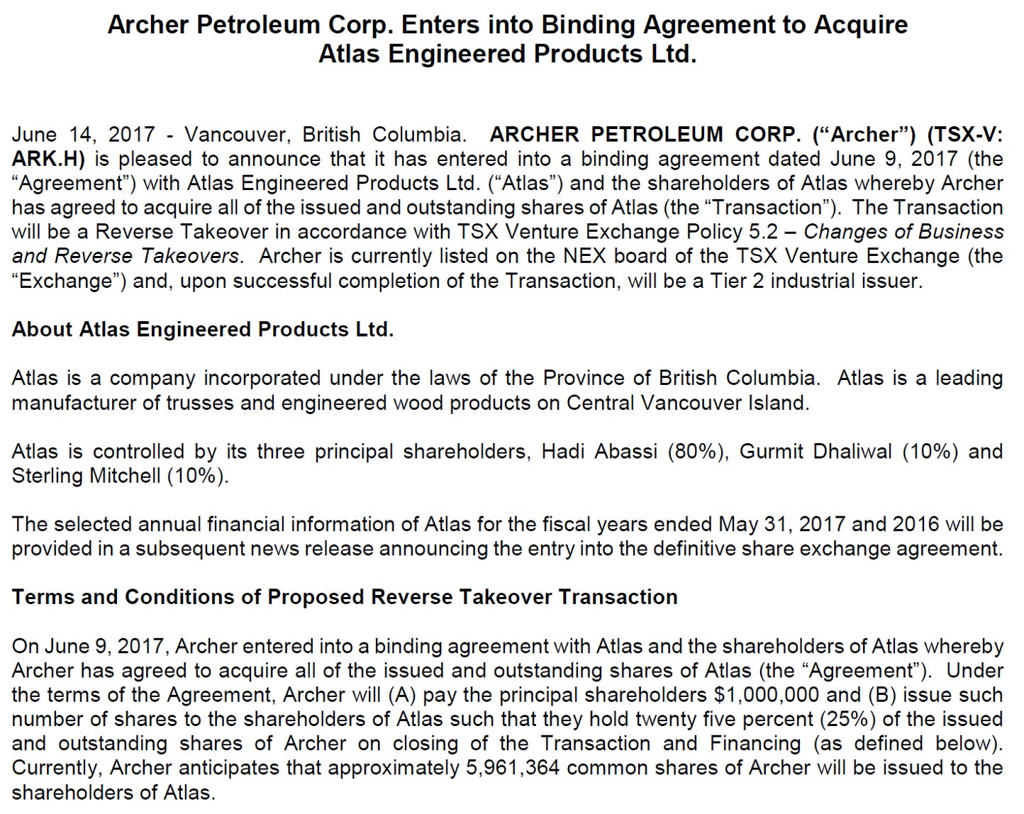We always enjoy looking back at the history of a company. For Atlas, their public venture started in 2017 through a typical reverse takeover with a long-troubled unrelated entity called Archer Petroleum Corp. (it was a shell by this point). However, the history of Atlas dates back to 1999 and has always been based in Nanaimo, B.C. The key person from the start is the current CEO Hadi Abassi. He stepped away from the leadership position in 2018 (never fully stepped away), but was brought back in 2021.