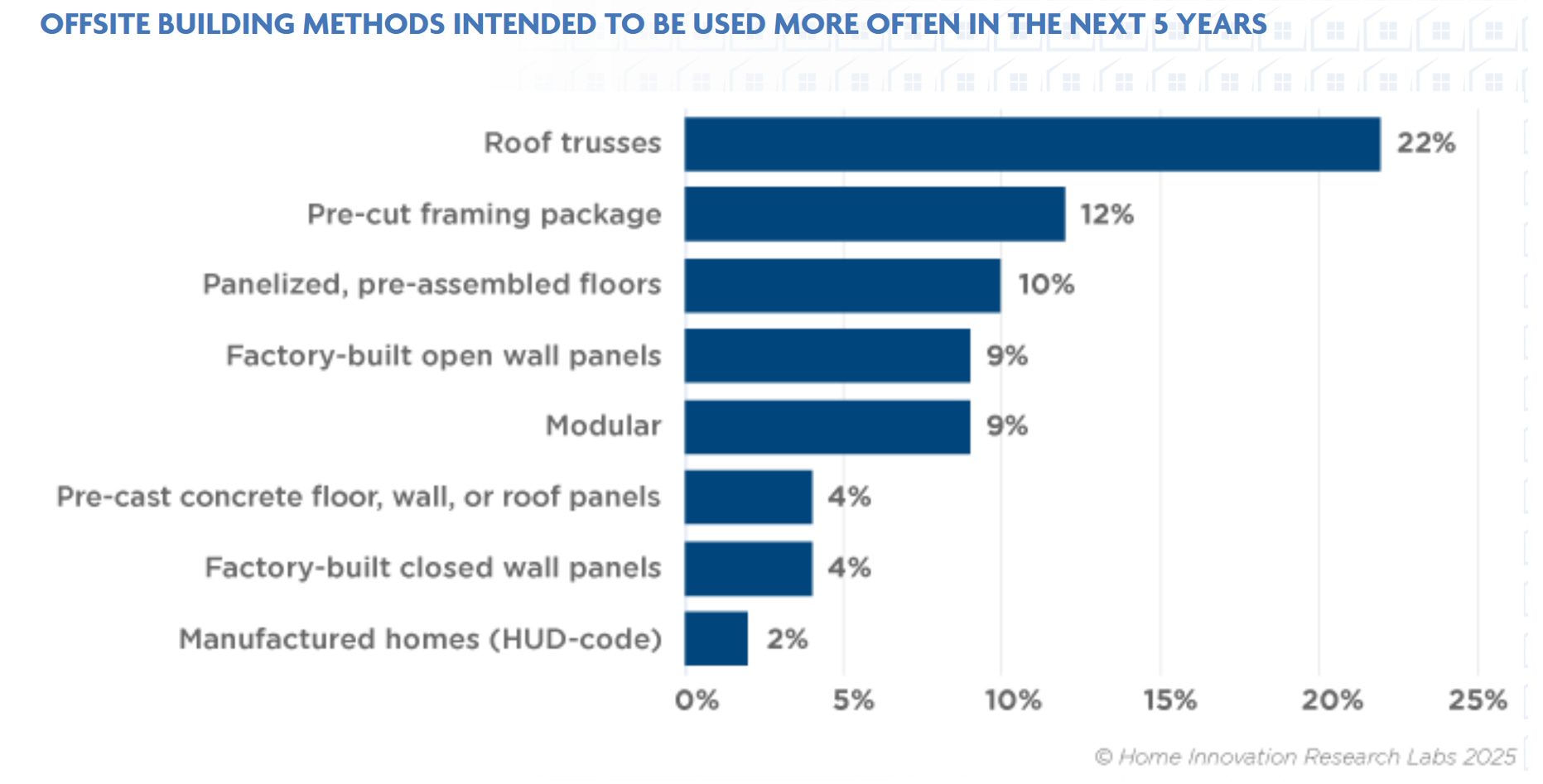 Roof trusses topped the list for intent to increase use in the future—not unexpected since most builders are comfortable with trusses. About 70% of all new homes are constructed with roof trusses presently. Following at a distance, however, was pre-cut framing, coming in ahead of the other options offered: open- or closed-wall panels, floor panels, modular, precast concrete, or manufactured homes.