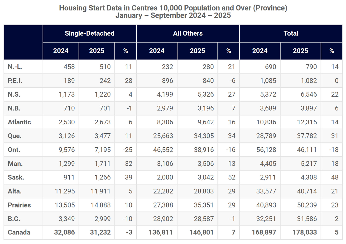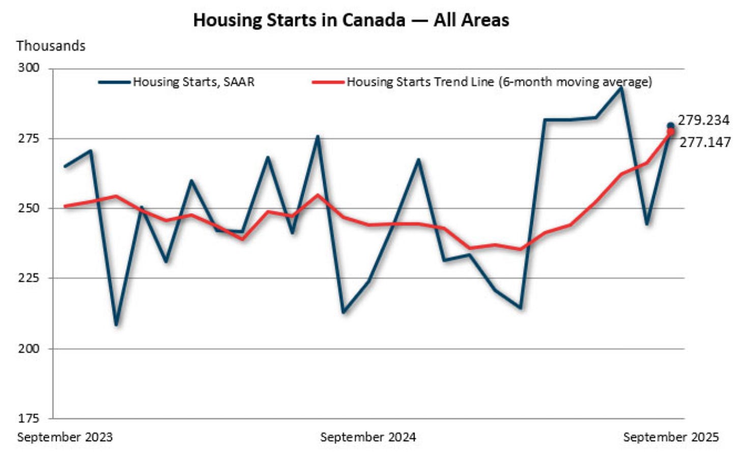 In the background, the key political parties view housing as key parts of their platform. For example, the Liberals recently announced their Build Canada Homes program. Ironically, announcements so far have likely hurt housing starts as builders delay projects, awaiting details on the nature of any support. https://www.pm.gc.ca/en/news/news-releases/2025/09/14/prime-minister-carney-launches-build-canada-homes