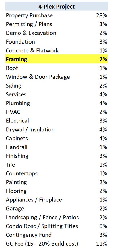 To give you context, here is how framing fits into the cost for a 4-plex build out based on discussions we had with a home builder.
