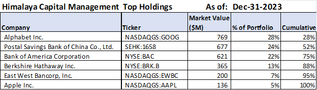 Another example continues to be Li Lu at Himalaya (the only person outside of Buffett who managed money for Charlie Munger). Note that 13F disclosures only capture U.S. listed stocks.