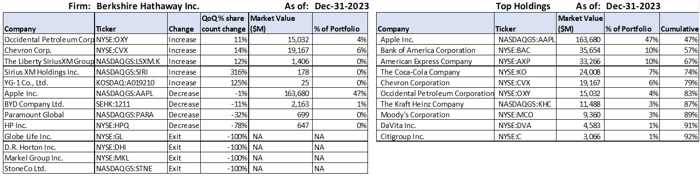 #1 Berkshire Hathaway continues to demonstrate concentrated investing, despite its size –Apple is now almost 50% of the stock portfolio and the top five positions make up 80% of value. Berkshire tweaked some holdings (noting that small holdings are likely Ted Weschler or Todd Coombs) and we are holding hands with them on Liberty (disclosed above; long LSXMA).