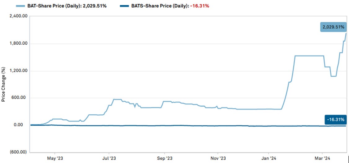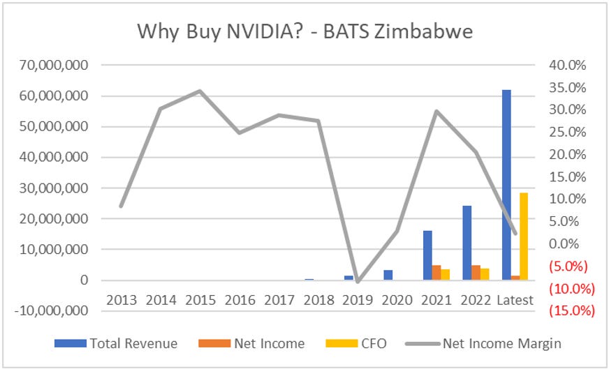 As part of our research into British American Tobacco (TL;DR we think it is cheap on very low expectations - https://canadianvalueinvestors.substack.com/p/inflation-and-stocks-the-first-rule), we came across their Zimbabwean subsidiary and could not resist looking into it. It is largely owned by BAT but listed on the Zimbabwean exchange. If you owned the subsidiary, you would be up a remarkable 2,000% in just the last year compared to a negative return for the parent. Who needs NVIDIA when you can get returns like this? Of course, these are not all measured in the same currency. Today we are going to provide a live example of what happens when inflation runs amuck and what might happen to your holdings if your country one day follows a similar path.