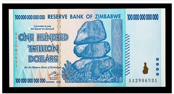 Have you ever held one hundred trillion dollars in your hand? We have. Back in 2008 during Zimbabwe’s hyperinflation, the government issued a remarkable 100 trillion dollar bank note that is now a collectable. One of us has a framed one in our office providing a daily reminder of how things can go very wrong… and keep going.