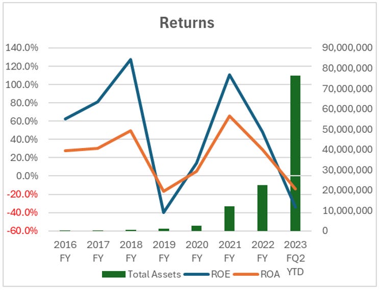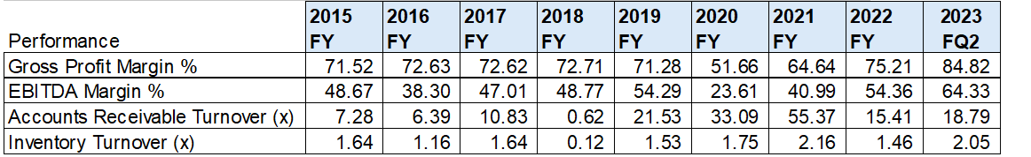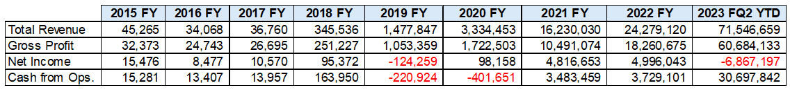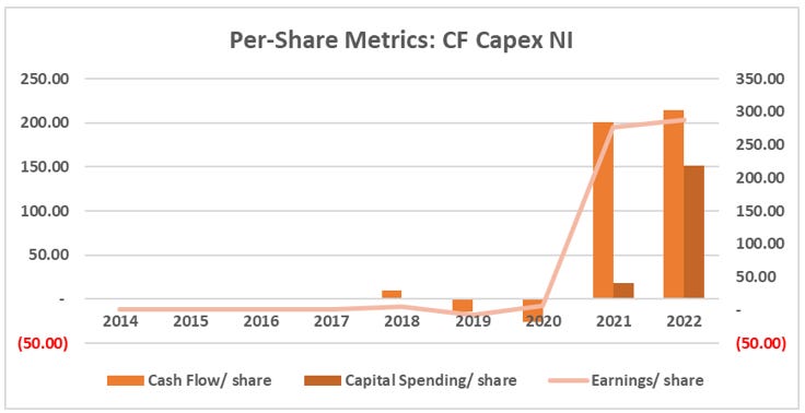 Standard financial performance metrics initially appear quite good. Strong gross and EBITDA margins and generally improving AR and inventory turnover. Sales are also going to the moon putting even NVIDIA’s revenue growth to shame. Per share metrics tell a similar story.