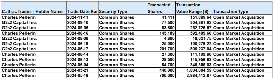 Since we wrote our August article, G2S2 and Charles Pellerin (affiliated with G2S2 – See Slate Office REIT articles https://www.canadianvalueinvestors.com/t/sotun ) have continued to buy. We expect that they might be a bit distracted for a bit though by their ongoing restructuring of Slate.