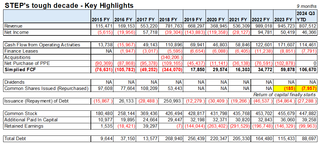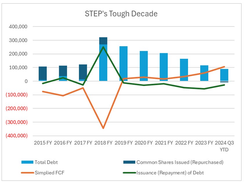 STEP is similar to Calfrac and Ensign (though STEP more so directly competes with Calfrac) in that the underlying business appeared to be improving and the market was just not interested. It has been a tough decade, with returns to shareholders just starting (via repurchases) after five years of de-levering.