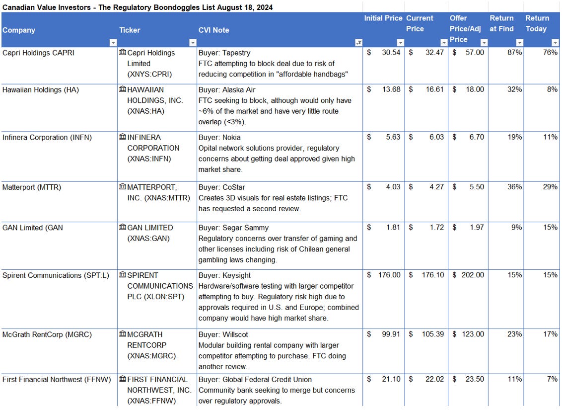 We are always looking through mergers to see if there is a bit of an arbitrage play for us. What we find remarkable is the number of mergers that are floating out there stuck dealing with regulatory uncertainty. Here’s a list of the main ones we have looked into. We are on the sidelines for all of these after our recent experience (see next). A big driver of this has been the FTC under Lina Khan. While some of her initiatives have been admirable or at least understandable, we scratch our heads about some concerns like a reduction in the competition in affordable handbags (CAPRI below). From the outside, it appears that they are just looking for a fight on every transaction rather than a thoughtful-but-still-consumer-oriented approach.