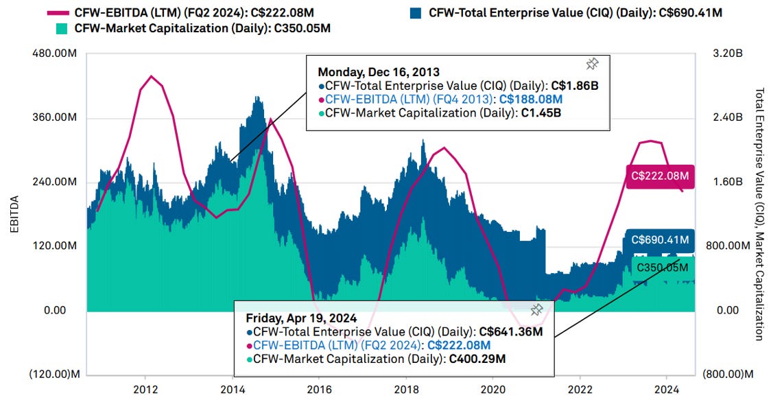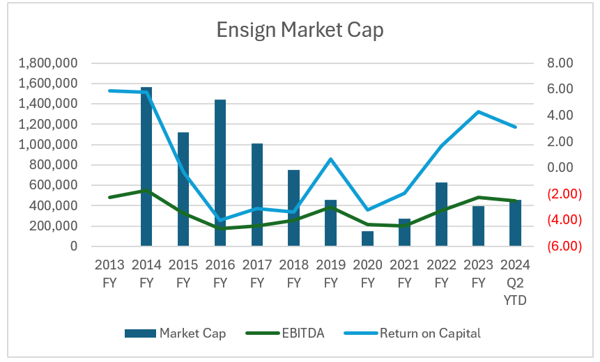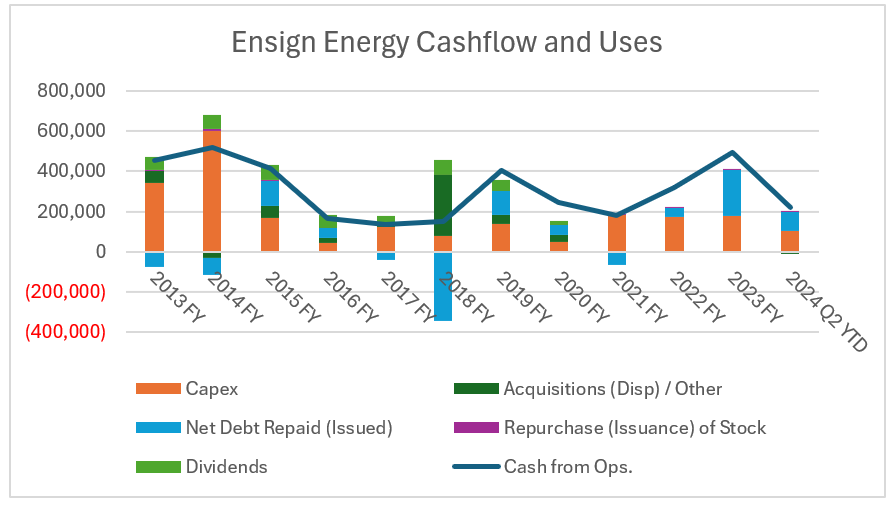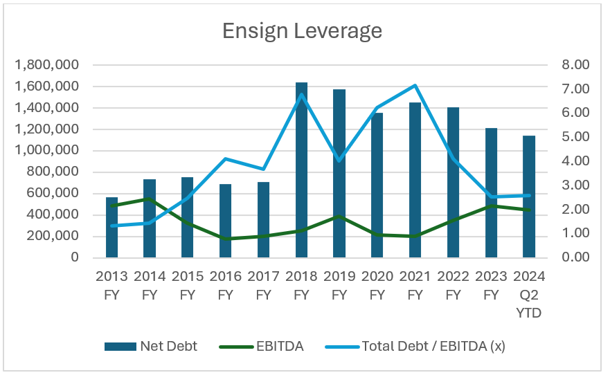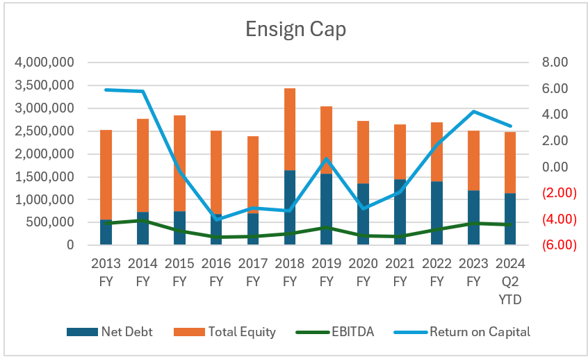 Where have we been and where are we going? As per their Q1 2024 call, “since 2019, Ensign has clipped off close to CAD 0.5 billion of debt off the balance sheet, that while executing on a few opportunistic acquisitions, which are generating strong EBITDA margins and free cash flow today. “will provide sufficient free cash flow to maintain our fleet in top condition and keep to our debt reduction targets of CAD 200 million a year.” Today’s market cap is ~$450MM.