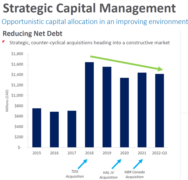 What really hurt Ensign was the timing of their acquisition of Trinidad Drilling. While opportunistic and made sense strategically, it just simply used too much debt.