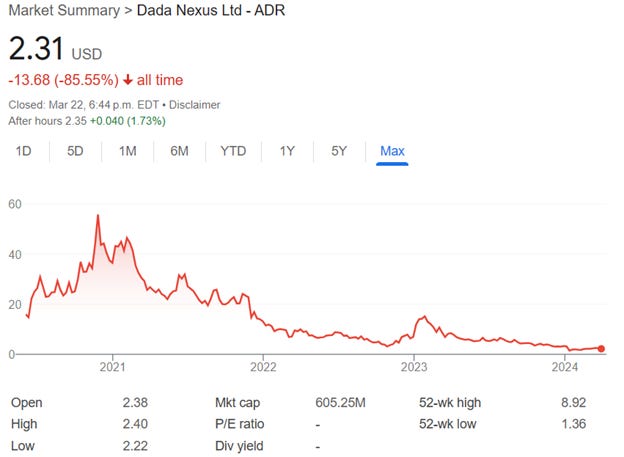 DADA - We have seen a number of fallen angel tech darlings crash with some getting bought out. In this case, a recent accounting scandal has not helped. Maybe this is another candidate given the interesting ownership structure, or at least it is an interesting case study.