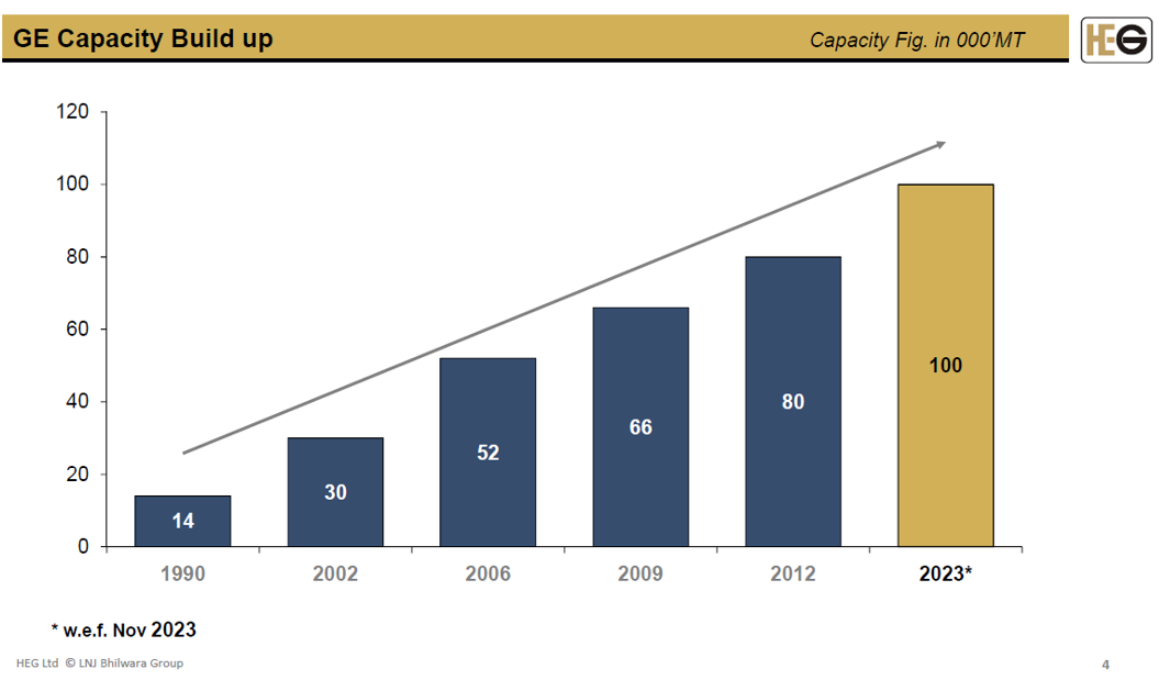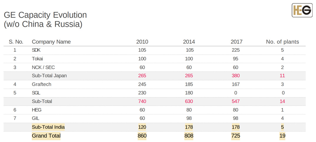 In the graphite electrode space there are really four key players outside of China besides GrafTech, being Graphite India, HEG, Tokai Carbon, and Resonac Holdings (a small division of a very large company). GrafTech is the only one that is vertically integrated with their own petroleum needle coke facility. There was real consolidation/rationalization in the 2010s. Since then, things have been relatively stable; see various tables from Graphite India, HEG, and Graftech that all align with each other below. However, competitors have not been idle. HEG is the best example (see next).