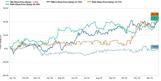 Of course, not every venture was smooth sailing and not all news was great . Taiga Building Products presented a tumultuous journey that ended up yielding a negative -1.34% return before dividends and positive 6% only after the surprise November dividend. We also spent time navigating through macroeconomic stories like FRC and banking sector turbulence, when there were much simpler paths to investing success. As Buffett says, in investing “you don't get any extra points for the fact that something's very hard to do.” Sadly, this year we bid farewell to legendary investors Charlie Munger and Sam Zell, whose wisdom and spirit continue to inspire us.