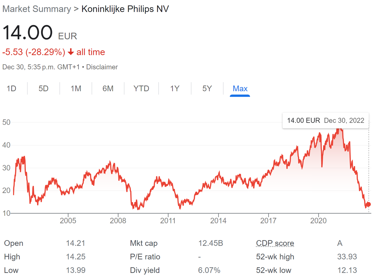 What a stock chart. Philips is a name that you are bound to know. What you might not know is that they are in the middle of a major recall of their sleep apnea CPAP machines and their stock has declined dramatically due to potential ranges of the final total costs, compounded by ongoing supply chain disruptions affecting the whole business. We think Philips is trading at a great value, even under a bearish scenario, and could be considered a bargain purchase in a few years.