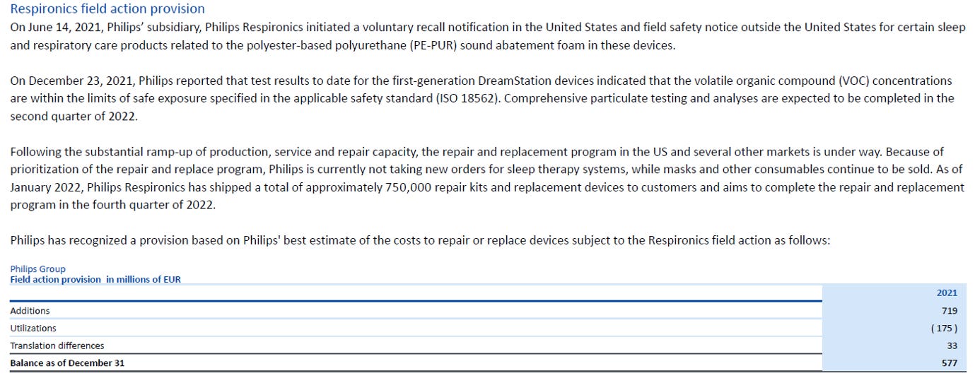 2021 Q4 - Now on your question of legal action. We have about 100 class actions, about 120 personal injury suits, all right? And then otherwise -- this is in the United States; and then outside of the U.S., not many, 1 or 2, let’s say, in Australia, Canada, and similar nature as in the U.S. And then we have the SEC claim as well from the -- from a shareholder suit. So that is the situation. It’s really very early to classify this. And as you know, we are very, very determined to provide, let’s say, the data such as with the VOC testing…We have also made organizational changes throughout 2021, which include onboarding new top management in the Sleep & Respiratory Care business; and further strengthening our quality and regulatory affairs leadership for the group, the Connected Care and the Sleep & Respiratory Care businesses…
