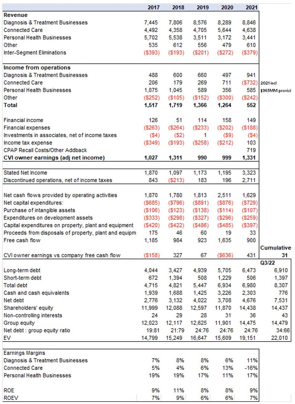 Behind the scenes Philips has been quite busy. They have focused on reducing their manufacturing footprint, consolidating their plants from ~50 to ~35, while making facilities more flexible to manufacture a wider number of products with the goal being to make overall manufacturing more resilient. They have also been making acquisitions along the way, some being quite material including the 2021 acquisitions of BioTelemetry (remote cardiac diagnostics and monitoring ) and Capsule Technologies (medical device integration, clinical surveillance and patient monitoring) for EUR 2.8 billion.