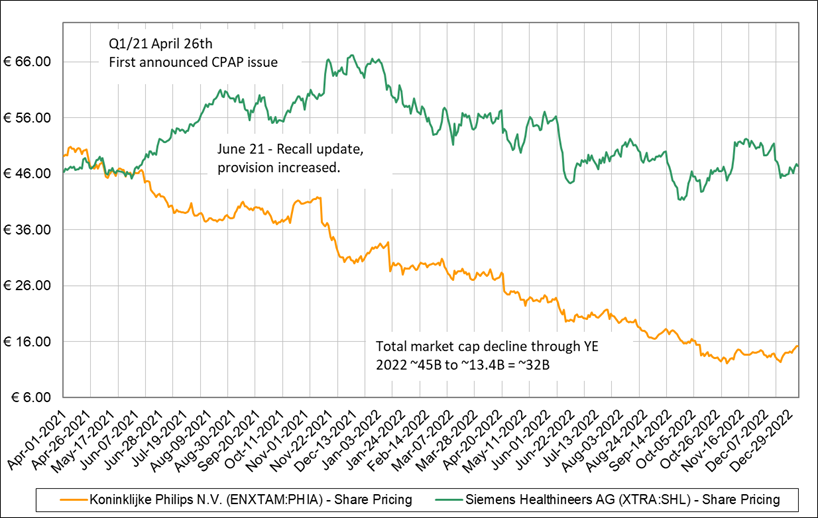 In April 2021 Philips disclosed that sound abatement foam in certain CPAP models was at risk of breaking down (i.e. disintegrating) and could potentially cause serious health problems. The stock chart below compares Philips to Siemens Healthineers, their most relevant public comparable.