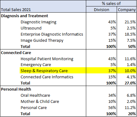 Philips’ remaining healthcare-focused divisions provide products and services to hospitals (e.g. MRI machines, healthcare providers (CPAP machines for sleep apnea that are then sold to individuals as part of care), and oral health (Philips Sonicare). Certain product lines are oligopolies, with market share controlled by a few key players and often have high switching costs. The best example is their imaging business. Philips focuses on higher end MRI/CT scanners that require significant capital costs and staff training, making switching difficult. Philips competes with Siemens and GE. CPAP machines worldwide are dominated (80%) by Philips and ResMed (with ResMed being in the lead).