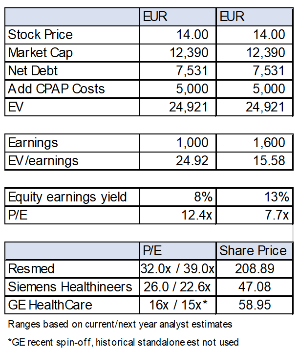 The CPAP recall is a real serious problem with potentially very significant legal liabilities. The stock has declined materially since the initial announcement, with the market cap declining from EUR 45 billion (~EUR 50/share) to EUR 13.4 billion (EUR ~15/share) at time of writing, with the decline being driven by relative concerns of Philips rather than the industry segment as a whole.
