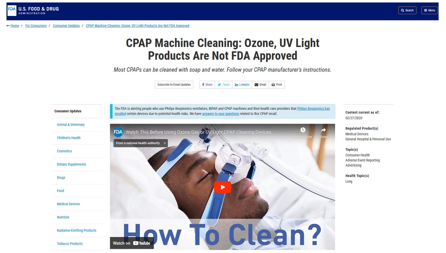 As we noted above, FDA guidance is clear on ozone cleaning and Philips never recommended ozone cleaning – “CPAP Machine Cleaning: Ozone, UV Light Products Are Not FDA Approved “