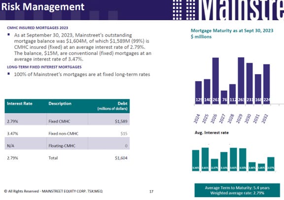 For us this seemed “high”, but in the world of real estate investors and lenders being used to Mainstreet’s peers leveraging much closer to appraised values and have much much lower interest coverage, Mainstreet was actually relatively underlevered. In a pronounced regional downturn they would likely have been one of the last real estate companies standing. In fact, in hindsight we think that absolute leverage was not so bad (they had and continue to have significant clear title and underlevered properties; As of September 30, 2023, the they had 82 clear title properties and five development lots with fair value of $468MM). They have also done a fantastic job of refinancing properties, moving towards longer-term fixed rates (the average 2021 refinancing was done at 10-year fixed rates of 2.07%; current average interest is 2.79% with average term to maturity of five years).