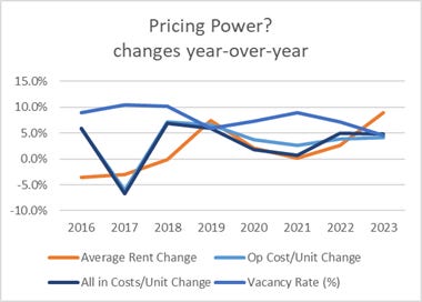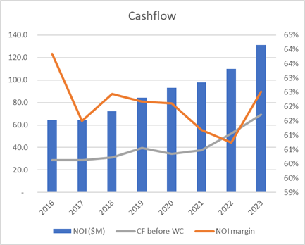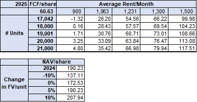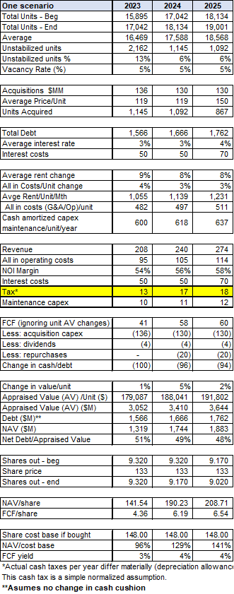 Secondly is cash flow. It is important to keep in mind that they are making significant investments still – over 1,100 units last year – and stabilization takes time. We think of free cash flow before investment capex. We note that like other property managers they are facing cost pressures and meaningful rent increases have not flowed through yet.