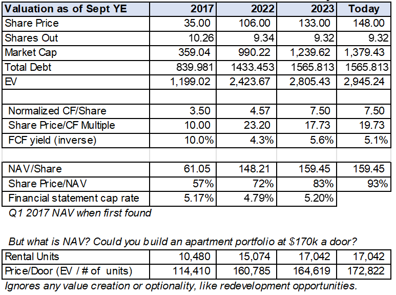 When we are looking at Mainstreet to see if it is undervalued, we have focused on two things: Cash flow per share and NAV per share. The Company was trading at approximately 57% of Q1 2017 net asset value but the discount has disappeared. One could argue that NAV could be overstated (it uses a market standard but low-for-us cap rate) but when thinking on a per door basis it seems reasonable, they continually make prudent acquisitions and unlock value, and increasingly have optionality from redevelopment of existing properties.