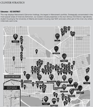 Redevelopment could eventually be another meaningful source of value as many properties are in good locations. This is coming to fruition now in Edmonton where they have a significant number of properties in the Edmonton ICE district (see below). The portfolio of decent apartments at a relative bargain will likely do well in most rental markets and likely safer than say high-cost brand new builds.