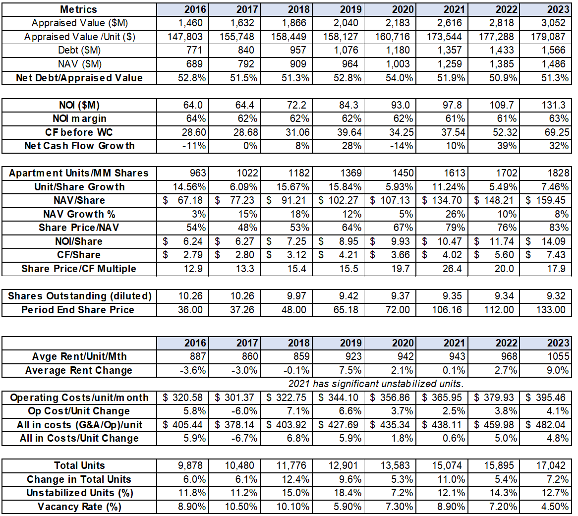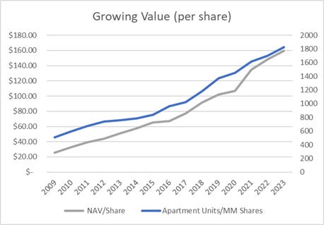 Back in 2017 when we first learned about Mainstreet, we did an article about their unique laser focused business model that they have consistently had for over 20 years. They seek out distressed mispriced mid-market real estate bargains and grew their apartment unit count from 1,370 in 2000, to 10,480 in 2017. Since then, they have grown to over 17,000 units without any dilution, continued to grow cash flow per share, NAV per share, and apartment units per share, while the stock has increased by another 300% (over 5,000% since founding).