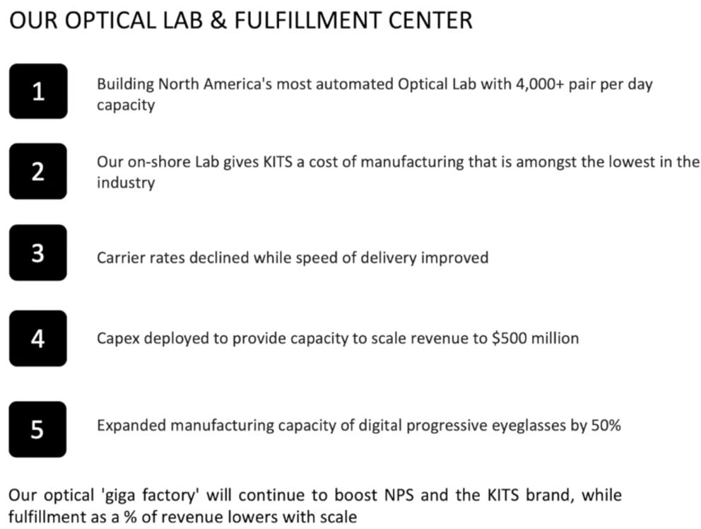 To put it simply, they sell glasses online. However, what they have done is built their own “state of the art” (in their words) manufacturing facility in Richmond, B.C. that is highly automated. What it has let them do is enable them to do is get a pair of glasses to a customer in only two or three days after ordering.