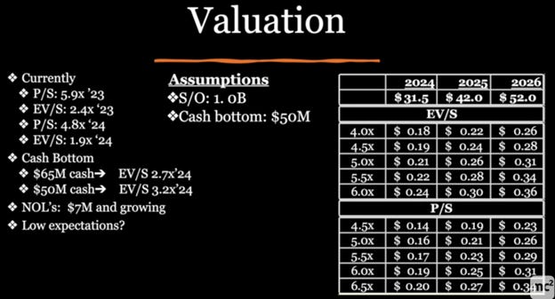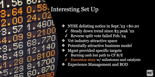 We note that this is a fallen 2022 IPO, peak of $3 and down to <$0.20. However, he argues that the business is at an inflection point and can be monitored with key milestones. We note the Company has no anchor shareholders to block or encourage takeover/go-private.