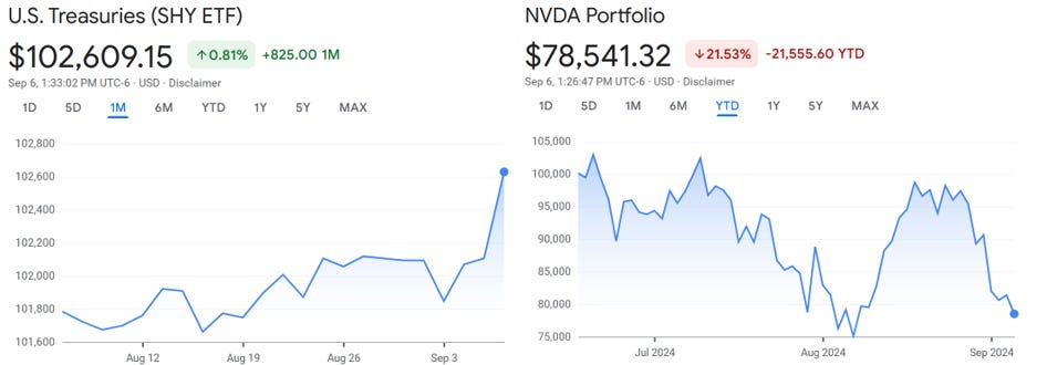 Here is our $NVDA vs U.S. Treasuries ~3 month update. So far, so good (for Treasuries). About $1,000 in Treasury dividends to date too helping juice those returns.