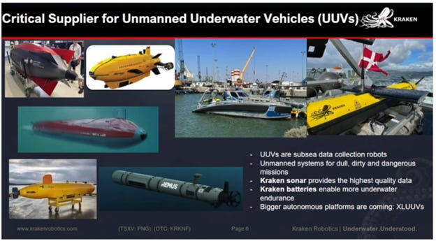 They are a Canadian company that started out as producers of synthetic aperture sonar for unmanned underwater vehicles (UUVs) for uses like naval mine-hunting and deep sea drilling. Kraken has expanded into producing its own sonar-equipped UUVs and specialized batteries. The company's revenue has surged from $4 million in 2018 to nearly $100 million in 2023, with strong contracts from navies worldwide. Kraken also sees significant future opportunities in battery demand and naval upgrades. He believes the most likely outcome is a takeover and notes a key customer of Kraken, Anduril, just did a $1.5 billion share issuance.
