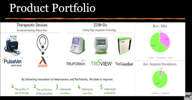 Zomedica is a veterinary MedTech company focused on improving the quality of care, clinic workflow, and profitability for veterinarians. Their primary products include PulseVet, a therapeutic system used mainly for tendon and ligament issues, and TrueForma, a point-of-care diagnostic system that generates recurring revenue through diagnostic assays. The company is also expanding into digital microscopes and remote monitoring systems. With strong gross margins (70%+) and promising execution under experienced management, Zomedica aims to improve cash flow and reach $50 million in revenue by 2025.