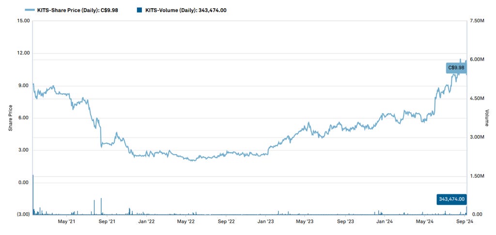 KITS was founded in 2018 by Roger Hardy, Joseph Thompson, and Sabrina Liak. The company went public on the Toronto Stock Exchange on January 19, 2021, following a $55 million IPO, with shares initially priced at $8.50. This was a frothy period for IPOs. Despite continued execution and revenue growth, the share price did not recover until earlier this year and is now on sale for $9.98.