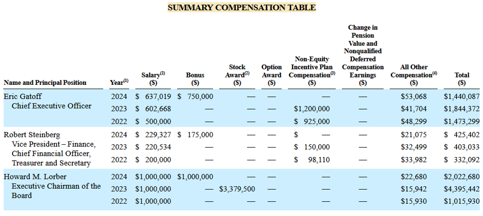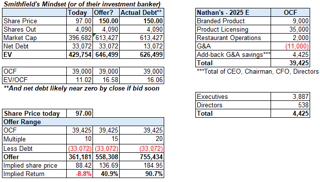 The value to Smithfield is clear. The contract is coming up in a few years, meaning Nathan’s negotiating power is increasing over time. Secondly, if acquired by Smithfield, Smithfield gets to save the licensing fees they were paying while gaining full control of the brand. If valuing just the licensing fees they would be paying a reasonable multiple, never mind the Branded Product, Restaurant Operations, and G&A savings. Executives and Board compensation is ~$4.5MM a year.