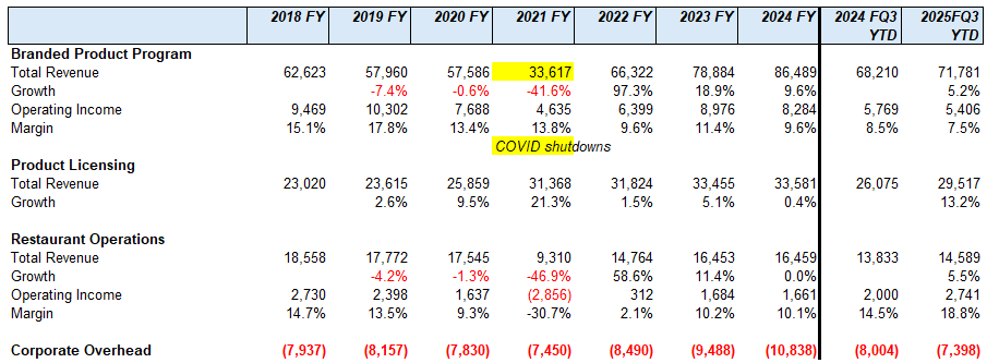 Product Licensing is key and there is one very important partner – Smithfield (see next). Branded Products are also important. The Restaurant Operations are largely breakeven, but could be valuable to the right buyer.