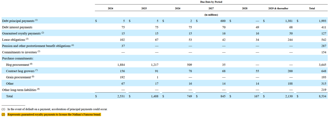 As part of going public, the thesis was pitched that Smithfield’s steps to reduce volatility from its profits are working as the Company shifts its focus from Hog Production to Packaged Meats while still maintaining some vertical integration. What a great way to emphasize growing stable cash flows by buying the royalty-like business of Nathan’s that you can just keep that margin you were paying to them for yourself?