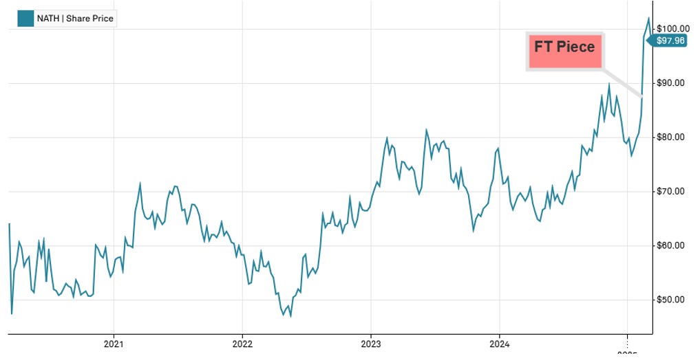 NATH $97/share. Market Cap: ~$400MM. Disclosure: Our newest position. We own this one.