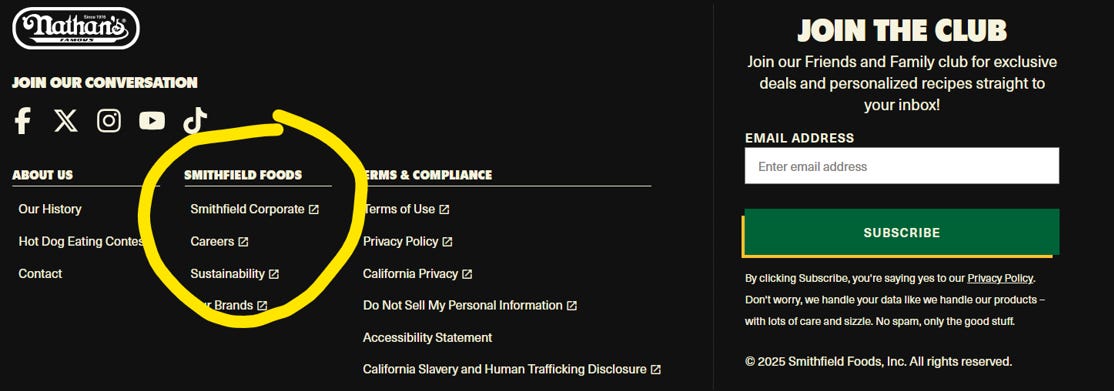 In addition, the Nathan’s website is actually run by Smithfield and presented as a Smithfield brand - https://nathansfranks.sfdbrands.com/en-us/