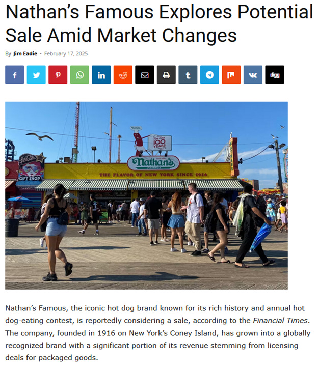 Rumours of the sale of Nathan’s first appeared in the Financial Times in February, but we prefer Swineweb’s coverage. What provides the real meat to the story is a part not covered; it is the actions the Chairman and key owner has been taking with his other business interests (See Why Now?) - https://www.swineweb.com/latest-swine-news/nathans-famous-explores-potential-sale-amid-market-changes/