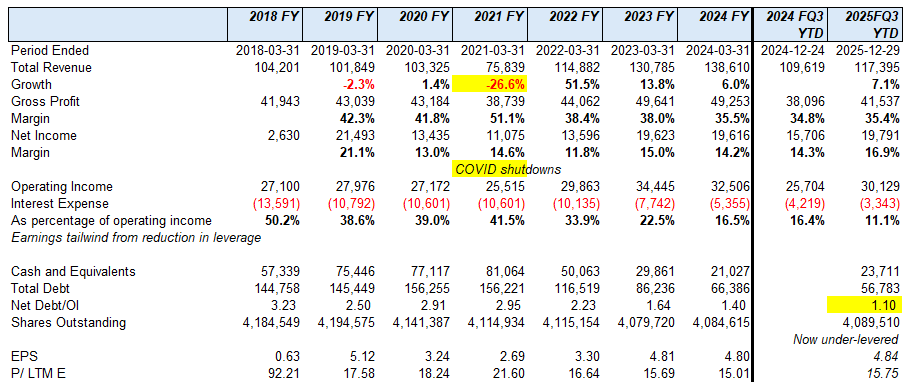 The Company has also de-levered over this period and are now under-levered and appear to be preparing for a sale. Leverage was originally due to the Company’s dividend recapitalization in 2015. Another indication is the recent withdrawal of their S&P Credit Rating (S&P B Stable prior to withdraw following the repayment of their rated notes in September 2024).