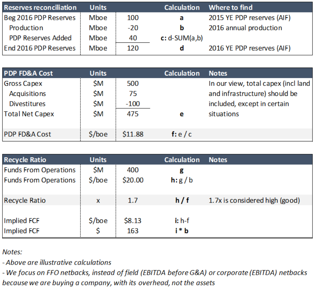 We prefer to use 3-year FD&A costs: SUM(3-year net capex) / SUM(total reserves added) to smooth out yearly fluctuations. There are exceptions such as for abnormally long lead-time projects (ie, oil sands), or if a huge gas plant is being built, etc, where we will adjust either capex or reserves to fit a unique situation. Companies sometimes argue that infrastructure (gathering lines, small gas plants, etc) should not be included in FD&A costs. We disagree, as things like gathering lines are required to get products to market. It would be like a dairy farmer ignoring the cost of machines to put milk into containers. When was the last time you bought milk straight from the cow at your neighbourhood farm?