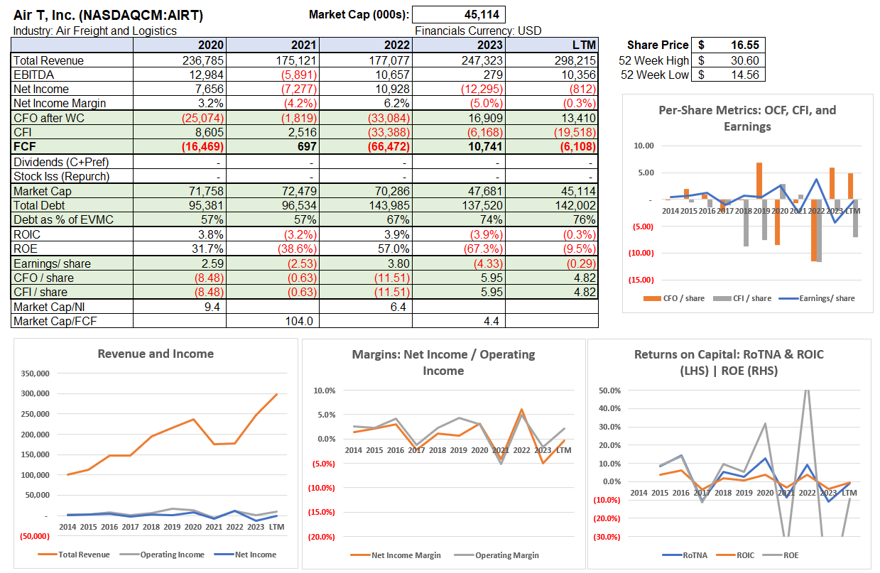 Air T operates a portfolio of aviation and related businesses, including overnight air cargo, ground support equipment manufacturing, and aircraft leasing. The company is doing a roll up and emphasizes a decentralized approach to managing its diverse operations.