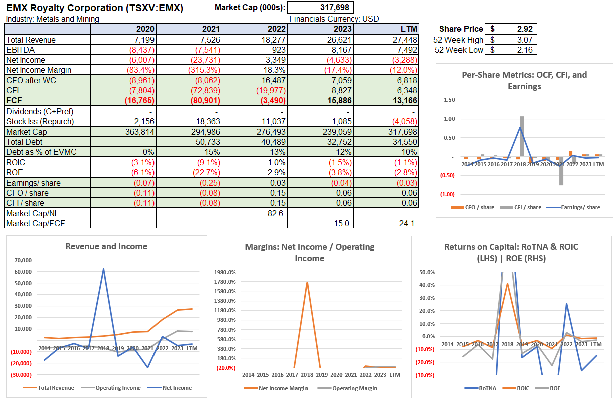 EMX Royalty is a royalty and project generation company focused on the mining industry. It acquires and develops mineral property interests globally, primarily in gold and base metals.