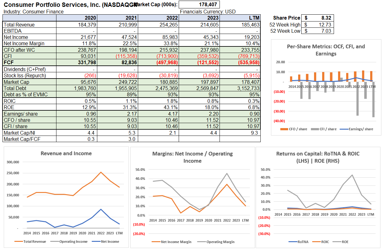 Consumer Portfolio Services provides indirect auto financing to consumers with limited or challenged credit. It purchases instalment sales contracts from auto dealers and services them internally.