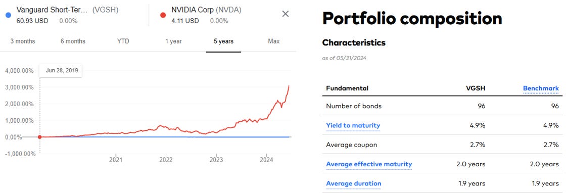 NVIDIA has, of course, dramatically outperformed U.S. Treasuries over the last five years (chart below excluding dividends). Will it over the next five, or will cash in hand from some government bonds win? Starting today, we will be tracking the race with Vanguard’s Short-Term Treasury ETF standing in for us having to track actual T-bills. And they’re off!